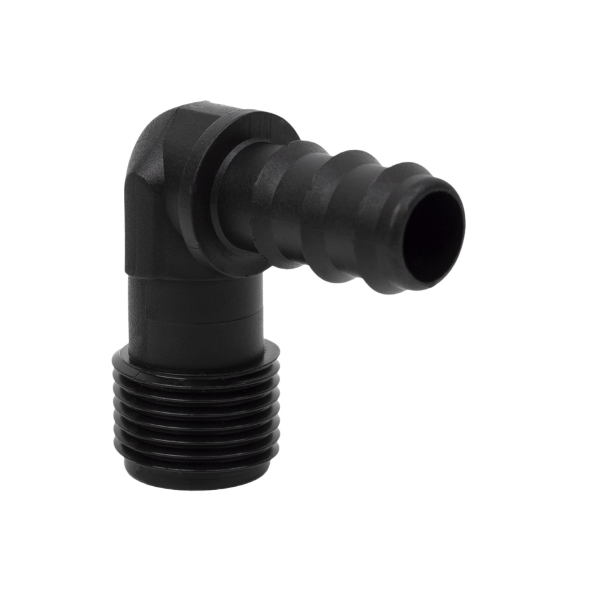 IBRIQO® Conector Codo 90º Rosca 1/2″ Macho a Manguera 16 mm – Riego por Goteo y Nebulización
