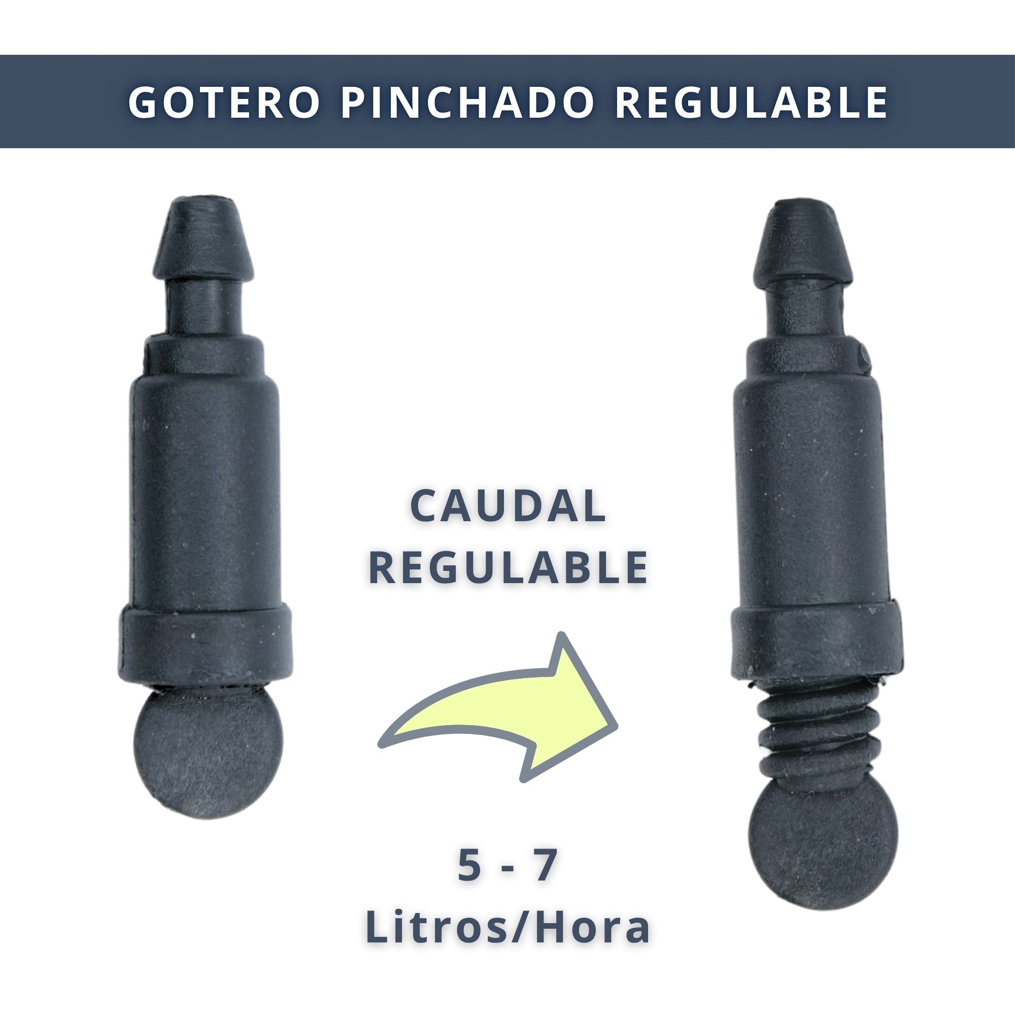 Gotero ajustable de 5 a 7 litros/hora para mangueras de riego. Ideal para jardines, terrazas, cultivos y más. Pack de 100 unidades resistentes y fáciles de instalar.