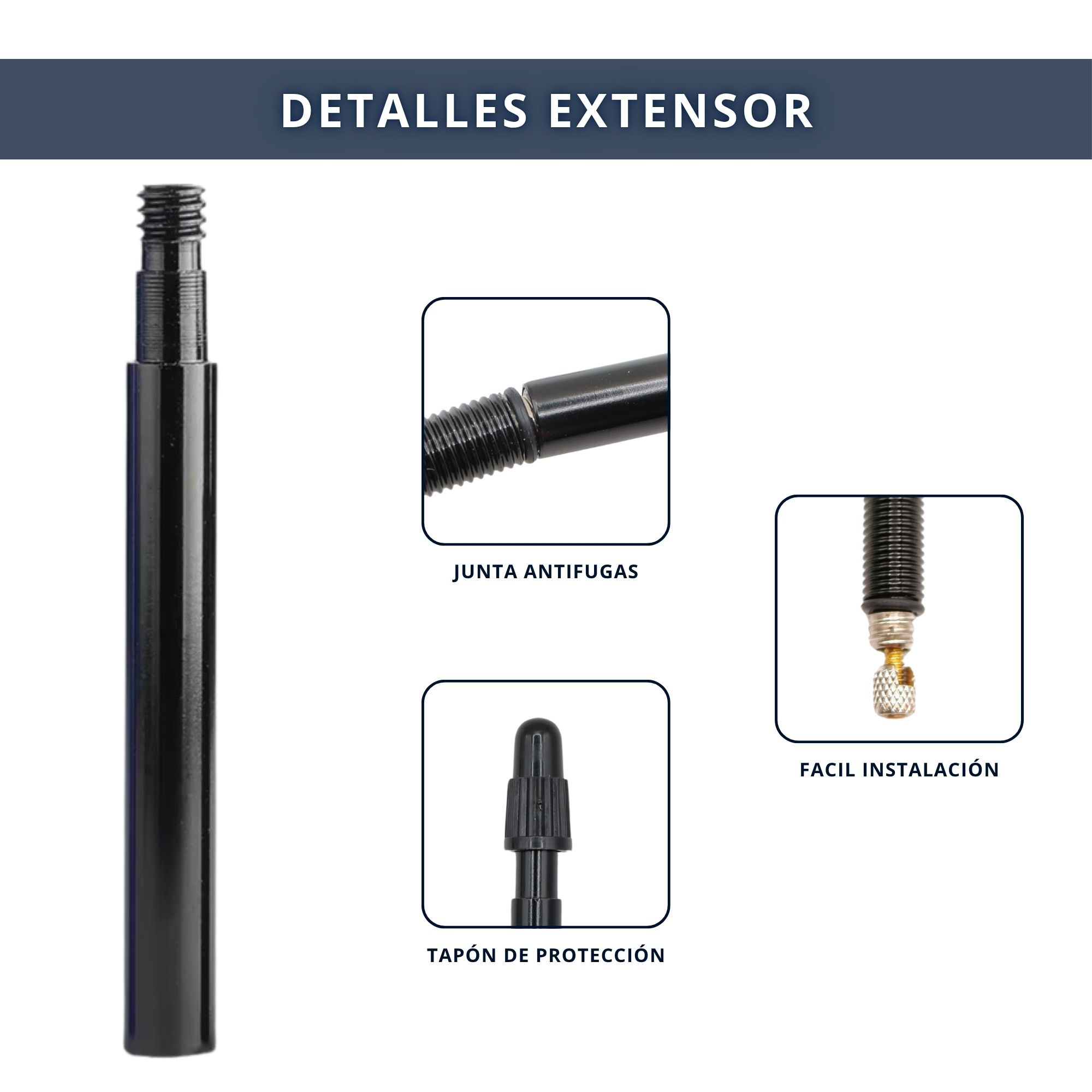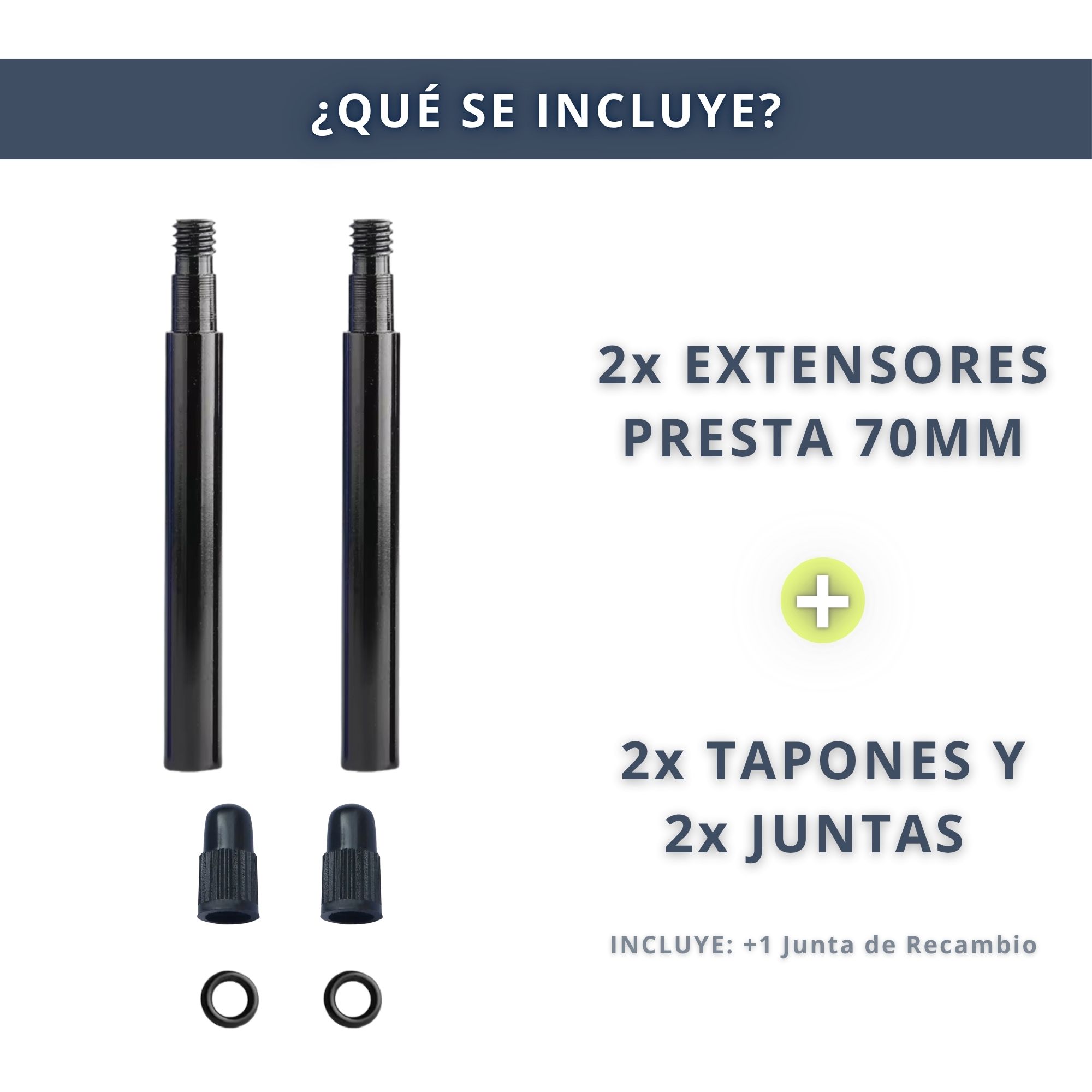 - Incluye: 2 extensores 70mm, 2 juntas + 1 de repuesto, 2 tapones antipolvo
